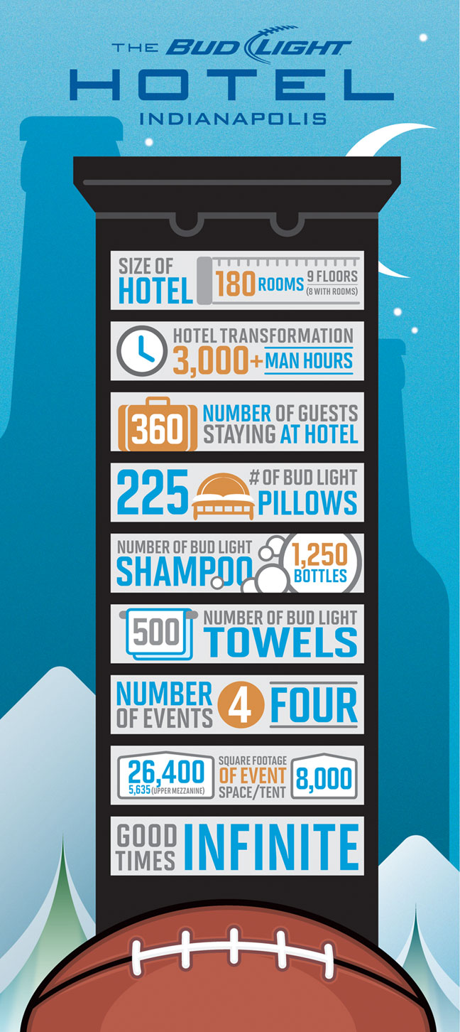 Bud Light Hotel Infographic for the Bud Light Hotel Indianapolis, Super Bowl XLVI. Share this: Share on X (Opens in new window) X Share on Facebook (Opens in new window) Facebook Like Loading... Related
